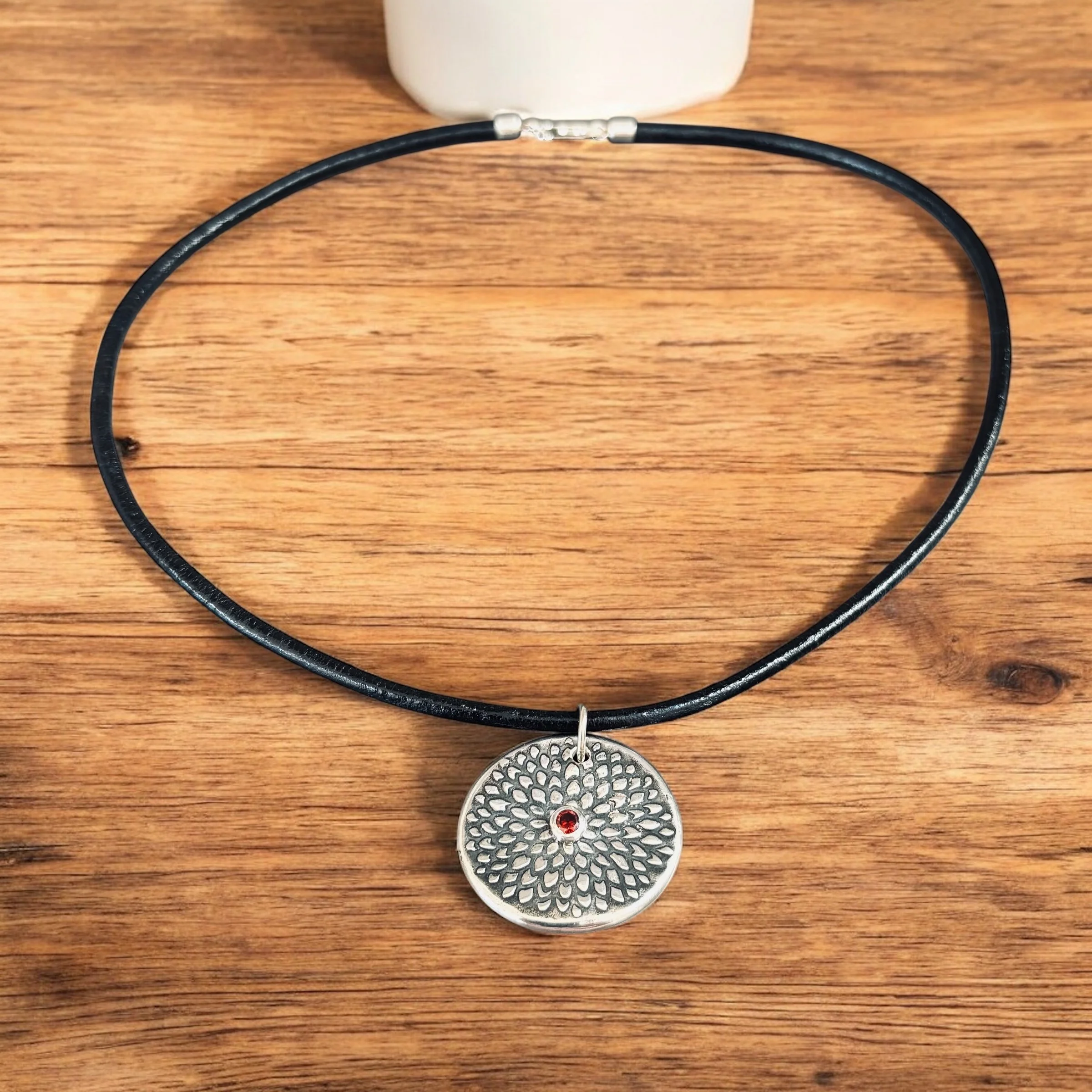 Hung from an 8mm sterling silver ring style bail and suspended through a 16” sterling silver belcher chain.