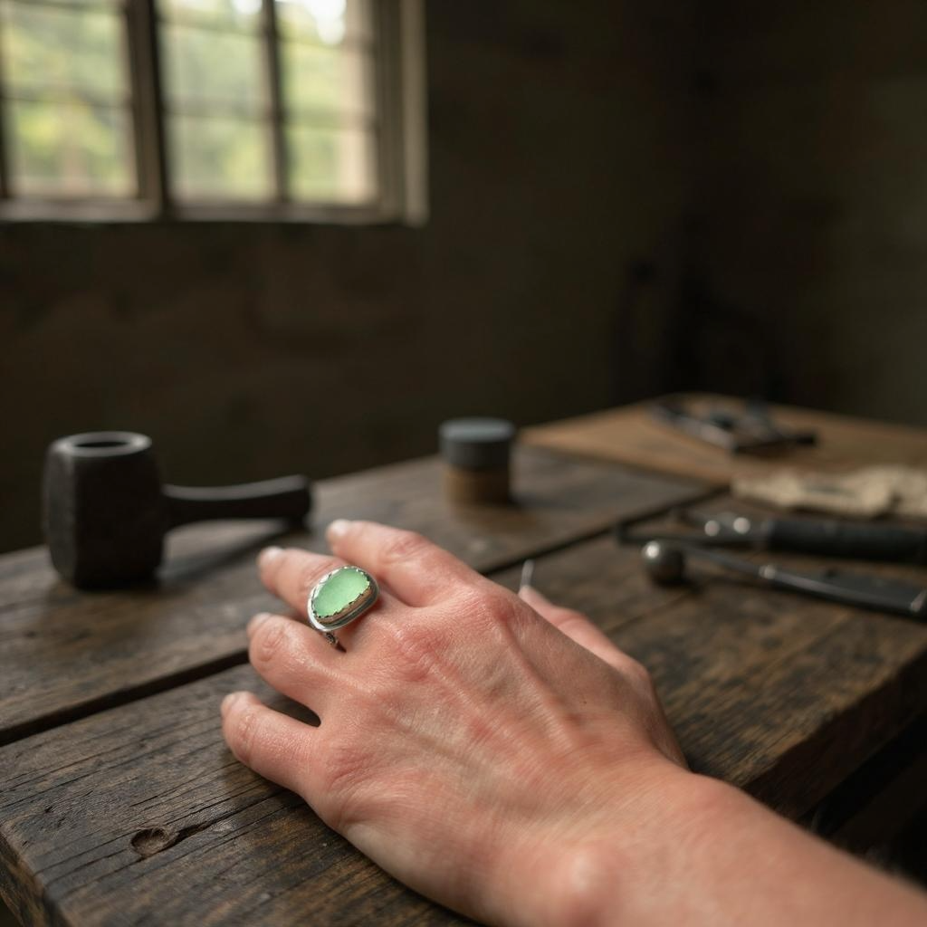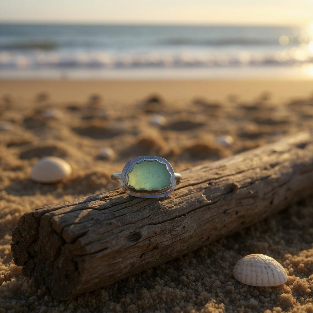 Each piece of sea glass tells a unique story, smoothed by the tides and transformed into a one-of-a-kind jewel that elegantly adorns the finger.